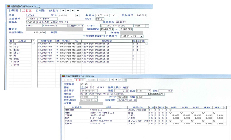 - 現品票(製作指示No/品名/コード/材質/材料(チャージNo)/各工程・処理条件)